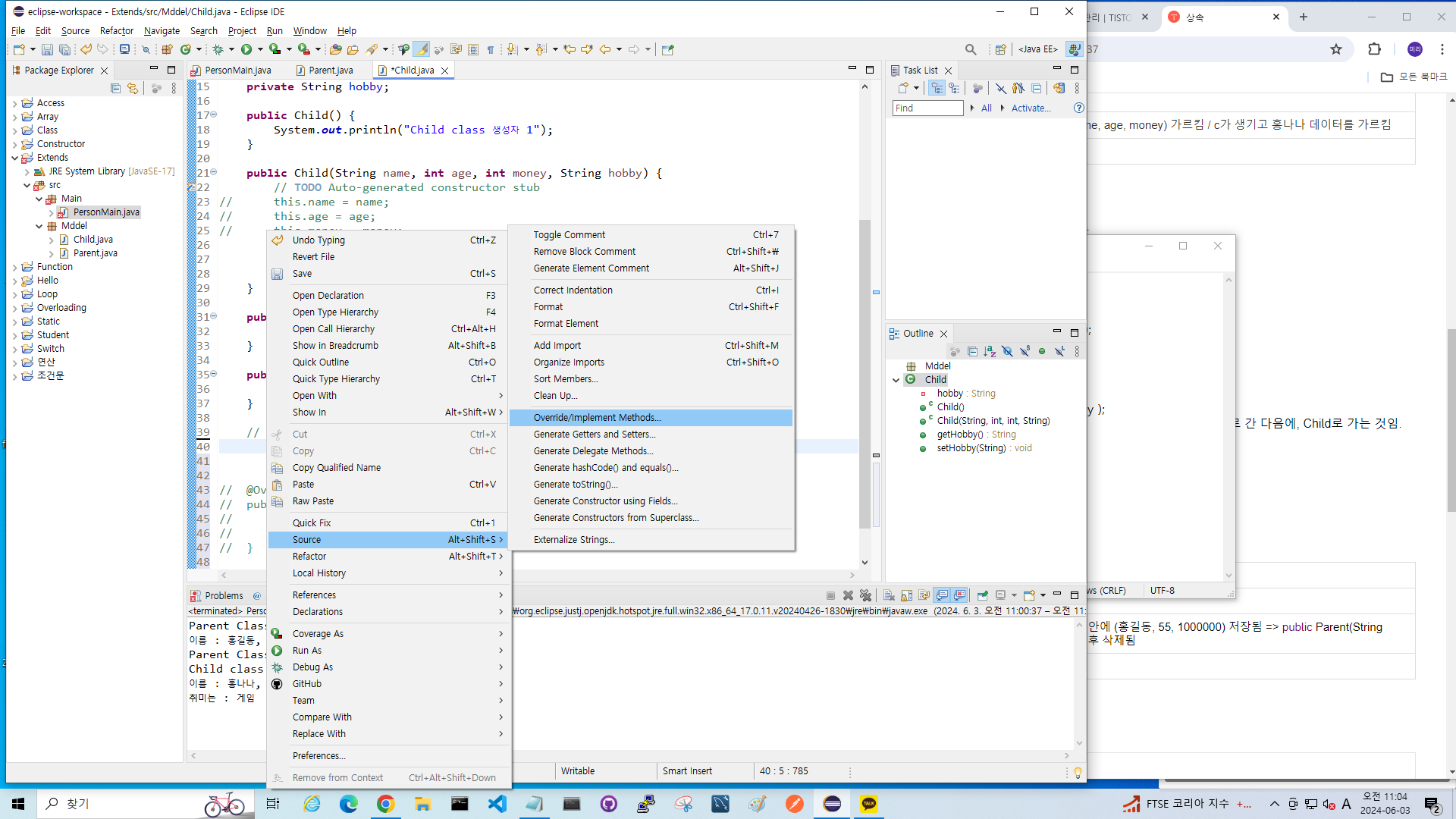 [Java] 메소드 오버라이딩 (Method Overriding) 오버라이딩(Overriding)상위 클래스가 가지고 있는 메소드를 하위 클래스에서 같은 시그니처(메소드 이름, 매개변수 타입 및 개수)를 갖는 메소드로 재정의 하는 것. => 상속받은 것을 내가 원하는 대로 커스터마이징 하는 것=> 상속관계 클래스에서 사용되며 static,final로 선언한 메서드는 오버라이딩이 불가능 메소드 오버라이딩 (Method Overriding)model 패키지 Parent class와 Child class 에 데이터 저장하고, main 패키지의 PersonMain class에서 실행했다. package model;public class Parent { //멤버 변수에 이상한것 넣지 못하게 private으로 하고, 게터세터에서 조건 넣어주기 protected String na.. Software Development/Java 2024.06.03